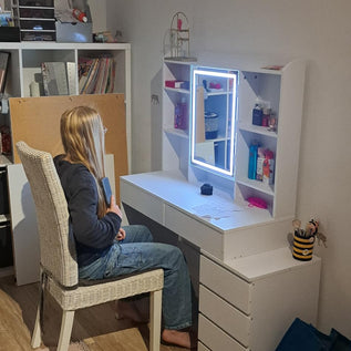 Jouw make-uptafel met 9 lades, LED-verlichting en 10x vergrotende spiegel.