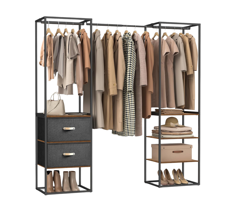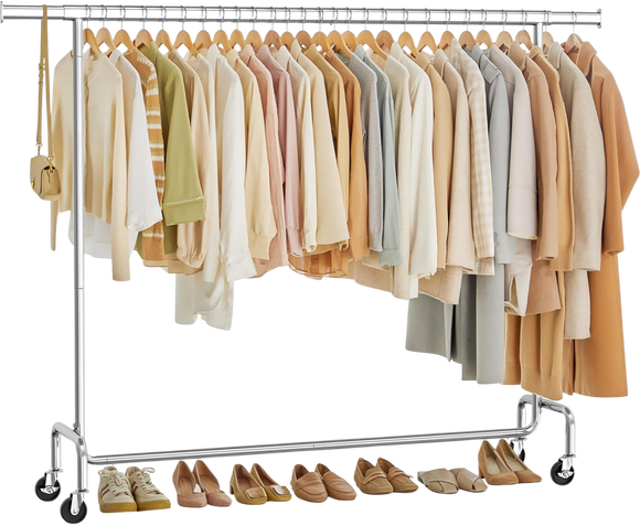Stevig kledingrek met 110 kg draagvermogen, uitschuifbare stang en soepele wielen. Snel te monteren en geschikt voor elke ruimte.